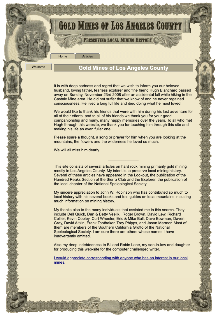 SoCal Grotto member Hugh Blanchard (1929-2008) created an amazing website about the gold mines of Los Angeles county. To protect the site from being lost forever, here’s a mirror: