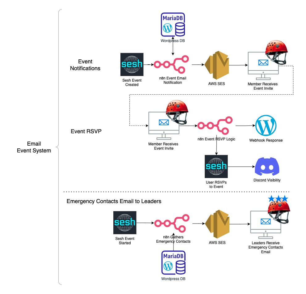 The brains of the integration is n8n. n8n listens for webhooks from sesh during an event’s lifecycle. Or for a user to select an RSVP, then responds accordingly.